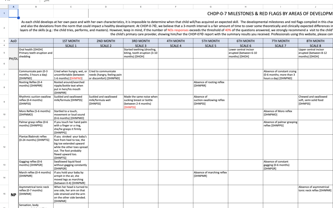 As each child develops at her own pace and with her own characteristics, it is impossible to determine when that child will/has acquired an expected skill. The developmental milestones and red flags compiled in this chart are meant to give parents and professionals a general idea of the main acquisitions and changes expected to occur in a determined period of life and also the deviations from the norm that could impact a healthy development.